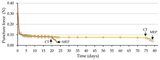 Time courses of endosperm weakening measured by the puncture force required to pierce the micropylar endosperm (ME) during the germination test, using a GA3 solution (500 mg L−1, in brown) or water (in yellow) to wet the substrate prior to ME piercing (MEP) by the radicle (3 days after testa cracking). The arrows indicate the dates on which the cracking of the testa (CT) and MEP occurred. Up to each CT, the values correspond to seeds with uncracked testa and from CT to seeds with cracked testa (prior to MEP by the radicle). Average values of four replicates of 10 seeds each. Vertical bars represent the standard error.