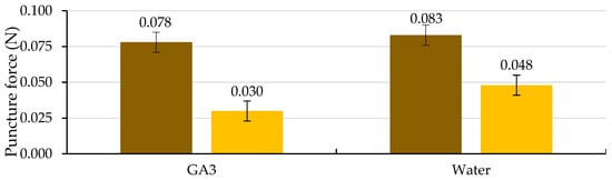 Of the two factors analyzed, testa cracking and the solution used to wet the substrate, only the first factor significantly affected the puncture force (p ≤ 0.05; Table 4 and Figure 10). Following testa rupture, the puncture force to pierce the ME decreased to 0.030 N with the use of GA3 and 0.048 N with the use of water, not differing significantly (p ≤ 0.05; Table 4 and Figure 10). The radicle emerged through a hole in the ME, which was fundamentally a consequence of the weakening of the tissue and, to a lesser extent, of the increase in the growth potential of the emerging radicle, as stated in the literature [], for tobacco seeds.