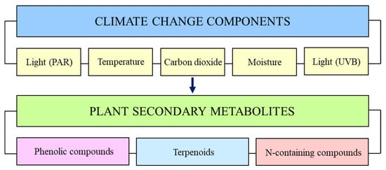 - Holopainen, J.K.; Virjamo, V.; Ghimire, R.P.; Blande, J.D.; Julkunen-Titto, R.; Kivimäenpäa, M. Climate change effects on secondary compounds of forest trees in the Northern Hemisphere. Front. Plant Sci. 2018, 9, 1445. [Google Scholar] [CrossRef]