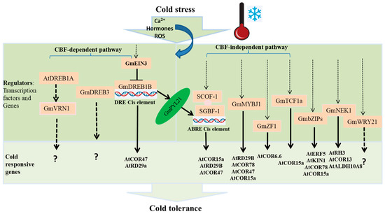 Several soybean genes have been shown to mediate cold tolerance (Table 2). Soybean cold-responsive genes function in multiple signaling pathways in transgenic Arabidopsis in response to chilling temperature stress in addition to the CBF-dependent pathway. Over-expression of soybean regulators, such as GmMYBJ1 (R2R3-type MYB genes), GmZF1 and SCOF-1 (C2H2 zinc finger gene), GmbZIP44, GmbZIP62 and GmbZIP78 (bZIP transcriptional factors), GmTCF1a (regulator of chromosome condensation 1 (RCC1) family genes), GmNEK1 (NEK family gene), and GmWRKY21 (WRKY-type transcription factor) in Arabidopsis can enhance cold tolerance [50,53,62,63,64,67,68]. Most of them enhance the expression of downstream COR genes in a CBF-independent pathway. Different regulators induce different target COR genes in transgenic Arabidopsis, e.g., GmMYBJ1 (AtRD29b, AtCOR47, AtCOR78, and AtCOR15a), GmZF1 (AtCOR6.6), GmbZIPs (AtERF5, AtKIN1, AtCOR78, and AtCOR15a), GmTCF1a (AtCOR15a), and SCOF-1 (AtCOR15a, AtRD29B, and AtCOR47).