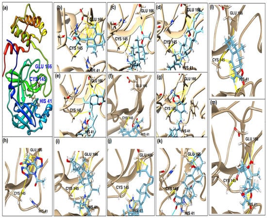 | g | Stigmasterol | ![]() | −6.8 | 31.13–33.56 | - | GLU 166 (7/1), (2.57–3.69) HIS 41 (5/1), (3.61–3.89) CYS 145 (3/1), (3.78–3.98) |