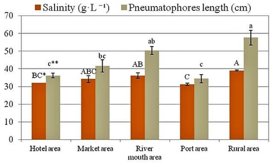 The lengths of pneumatophores from five experimental locations corresponded well with the salinity values (Figure 1). The higher the salinity value, the longer the pneumatophores were. The longest roots came from the rural area (57.6 cm), while the shortest were from the area surrounding the port (34.4 cm) (Figure 1). The pH value was 8.0 and did not differ between locations (data not shown).