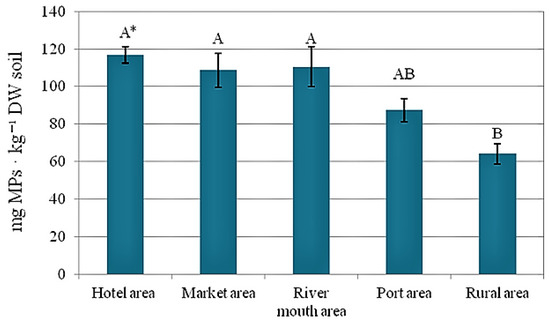 The mean weights of the MPs separated from the soil samples collected in the experimental locations are presented in Figure 2. Samples from the mangrove vegetation near the hotel area revealed the highest MP content (116.9 mg per kg of dry soil). Large amounts of plastic were also found in soil samples from the market and river mouth areas. Significantly the smallest amounts of MPs were found in the soil samples from the rural location, with an average MP mass of 64.2 mg per kg of dry soil (Figure 2).