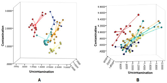 Figure 3. Distances between the centroids of soil samples (A) and pneumatophores (B); red—rural area; orange—market area; turquoise—port area; dark blue—hotel area; yellow—river mouth; no contamination—apparently very low plastic content in (rural) site (therefore, used as a reference), contamination—four anthropogenized locations visibly polluted with plastic.