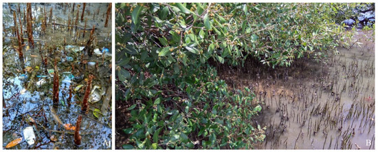 The mangrove biome is recognized worldwide as constantly threatened due to its proximity to urban and industrial zones that dump a wide range of pollutants with little or no treatment [39,40]. Mangrove thickets are natural filters for the contaminants that do not readily decompose, such as MPs [9,40,41,42,43], and thereby play an important role in the ecological purification of water [44,45]. The muddy mangrove sediment can contain up to eight times more MP than non-mangrove residues [42]. These plants are also considerable depositional stores of sediment-associated TEs due to their ability to control the redox conditions of diagenetic reactions and to enrich the sediments in organic matter that is capable of binding TEs [22]. The presence of TEs was also detected in Avicennia spp. plants [4,22,46]; however, the identified concentrations in plants were generally lower than in the sediment [22].