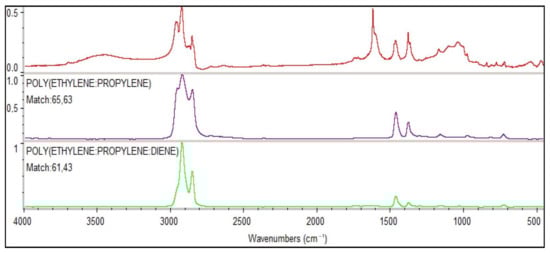 Thermo Fisher Scientific’s OMNIC 9 software was applied for the identification of polymers present in the soil and pneumatophore fragments. Experimentally registered spectra of each sample were entered into a software database and matched with the reference spectra (Hummel Polymer Sample Library and the HR Nicolet Sampler Library). Because soil and pneumatophore samples were not previously purified with the wet peroxide oxidation (WPO) method (which could have damaged the samples), the compatibility of polymers was inferred from the compound rating displayed by the software, not from the percentage value (Figure 7).