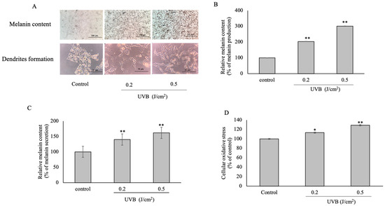 The effect of UVB on B16F10 cells at different concentrations (J/cm2), Pictures of melanin content, and dendrite formation of UVB induced cells (A) The melanin production (B) and secretion (C) are related to melanin content and dendrite formation. Results were expressed in a bar graph as the percentage of melanin production and secretion. Cellular oxidative stress was present as a bar graph (D). The statistical significance of differences of each group was calculated by mean ± SD with the control (100%). *, ** Statistical significance at p ≤ 0.05 and p ≤ 0.001, respectively.