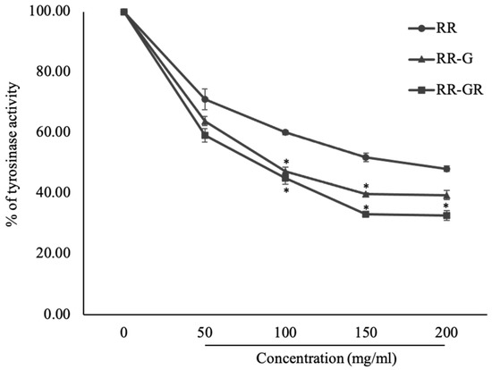 Tyrosinase activity related to melanogenesis was used to investigate the extracts’ ability. The results found that the RR-GR extract was in a significant decrease in tyrosinase enzyme activity from 100% to 32.70 ± 1.640% while RR-G at 39.41 ± 1.490% when compared with the RR sample (48.06 ± 0.920%) at p ≤ 0.05 in a dose-dependent manner (Figure 2). Hence, the RR-GR extract plays an important role in suppressing tyrosinase enzyme activity related to melanogenesis.