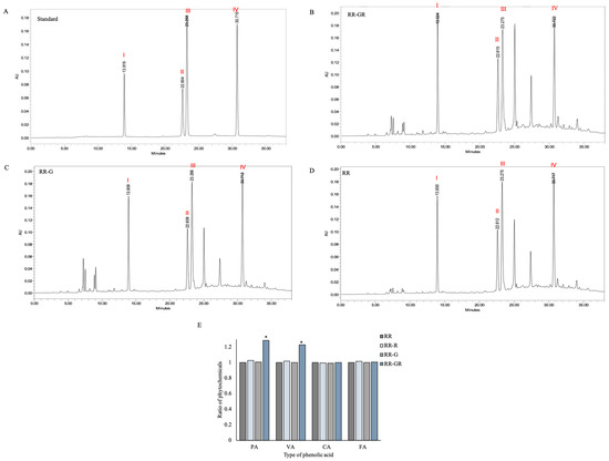 HPLC chromatogram of standard (A), riceberry rice with germination and radiation (RR-GR) (B), riceberry rice with germination (RR-G) (C), and riceberry rice (RR) (D). Percentage of area was presented in bar graph (E). The number represented in each type of phytochemicals I: protocatechuic acid (PA), II: vanillic acid (VA), III: caffeic acid (CA), IV: ferulic acid (FA). * Statistical significance at p < 0.05.