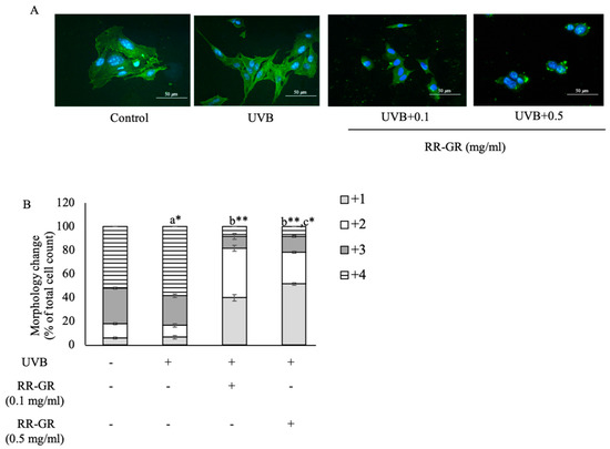 The morphology of B16F10 cells was observed under the fluorescence microscope. First, the dendrite formation was invested followed by the localization of F-actin. This study was investigated under the F-actin rearrangement. In UVB-induced cells, dendrite formation-related F-actin rearrangement was presented higher than in the control (untreated cells), and RR-GR treated cells. Moreover, RR-GR treated cells at 0.1, and 0.5 mg/mL had significantly reduced dendrite formation in a dose-dependent manner (Figure 6A). F-actin arrangement-related dendrite formation was scored low to high at 1+, 2+, 3+ and 4+, respectively, and presented in the bar graph. UVB-induced cells were shown in the highest population of cells in score number 4+ at 57 ± 1.000%. In contrast, RR-GR treated cells at 0.1 and 0.5 mg/mL were at 7 ± 1.732% and 6 ± 1.211% in a dose-dependent manner. However, RR-GR treated cells at 0.1 and 0.5 mg/mL were mainly shown in the lowest dendrite formation; the score was 1+, at 38 ± 2.640% and 52 ± 1.000% in a dose-dependent manner (Figure 6B).