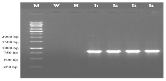 Figure 1. Agarose gel showing PCR amplification of the CP gene of ToLCNDV-Rg infecting the ridge gourd. Lane M: 1 kb molecular marker; Lane W: Water control; Lane H: Healthy sample; Lane I1, I2, I3, and I4: Infected ridge gourd samples.