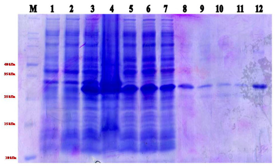 SDS-PAGE was carried out according to the procedure described by Laemmli [38]. Twenty microlitre of the sample or purified protein was mixed with 20 of Laemmli buffer, heated for 10 min at 95 °C, and loaded on a 14% SDS PAGE gel. A pre-stained protein molecular weight marker (Cat No. SM0441, Fermentas, Eschenstr, Germany) (5 µL) was used for comparison of the molecular weight of the recombinant protein. Electrophoresis was carried out at 70 V until the dye front reached the resolving gel and then at 90 V for 4 h.