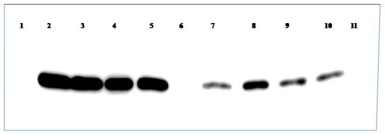 41. Towbin, H.; Staehelin, T.; Gordon, J. Electrophoretic transfer of protein from polyacrylamide gels to nitrocellulose sheets: Procedure and some applications. Proc. Natl. Acad. Sci. USA 1979, 76, 4350–4354. [Google Scholar] [CrossRef]