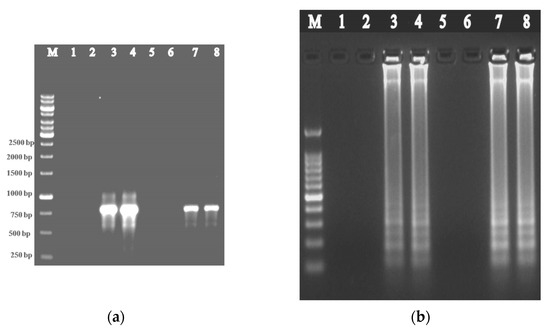 Figure 4. Agarose gel showing the amplification of ToLCNDV-Rg-CP gene from non-immunocaptured and immunocaptured plant samples using ToLCNDV- CP specific primers through (a) IC-PCR and (b) IC-LAMP assays. Lane M: 1 Kb DNA marker; Lanes 1 and 5: Water control; Lanes 2 and 6: Healthy samples; Lanes 3 and 4: Infected ridge gourd samples; Lanes 7 and 8: Infected immunocaptured ridge gourd samples.