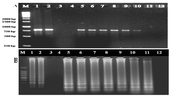 Figure 5. Comparative analysis of the sensitivity of IC-PCR and IC-LAMP using serial dilutions of ToLCNDV-Rg-CP-PAb (A) IC-PCR, (B) IC-LAMP. Lanes 1 and 2: Positive samples; Lane 3: Water control; Lane 4: Healthy control; Lane 5: 1:2500 dilutions of the antibody; Lane 6: 1:5000; Lane 7: 1:10,000; Lane 8: 1:20,000; Lane 9: 1:40,000; Lane 10: 1: 80,000; Lane 11: 1:1,000,000; Lane 12: 1:2,000,000.