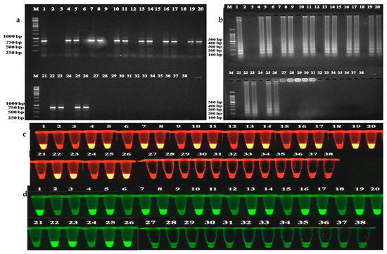 Figure 6. Immunocapture assays for samples from various host plants suspected to be infected with begomoviruses and their visualization on agarose gel using dyes (a) IC-PCR, (b) IC-LAMP, (c) EtBr, and (d) VeriPCR dyes. Lane M: 1 kb DNA marker; Lane 1: Positive control (Infected ridge gourd); Lane 2: Negative control (Buffer); Lane 3: Healthy ridge gourd; Lane 4, 5: Infected ridge gourd; Lane 6: Healthy watermelon; Lane 7, 8: Infected watermelon; Lane 9: Healthy cucumber; Lane 10, 11: Infected cucumber; Lane 12: Healthy pumpkin; Lane 13, 14: Infected pumpkin; Lane 15: Healthy bitter gourd; Lane 16, 17: Infected bitter gourd; Lane 18: Healthy bottle gourd; Lane 19, 20: Infected bottle gourd; Lane 21: Healthy sponge gourd; Lane 22, 23: Infected sponge gourd; Lane 24: Healthy tomato; Lane 25, 26: Infected tomato; Lane 27: Healthy chilli; Lane 28, 29: Infected chilli; Lane 30: Healthy capsicum; Lane 31, 32: Infected capsicum; Lane 33: Healthy cowpea; Lane 34, 35: Infected cowpea; Lane 36: Healthy French bean; Lane 37, 38: Infected French bean.
