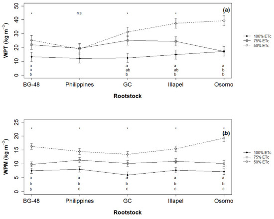 Water productivity based on total yield (WPT, kg m−3) (a) and marketable yield (WPM kg m−3) (b) at three irrigation levels of watermelon cv. Santa Amelia F1 grafted onto five L. siceraria rootstocks. * and n.s denote the level of significance at 5% and non-significant re-spectively, according to Fisher’s LSD test with Bonferroni correction.