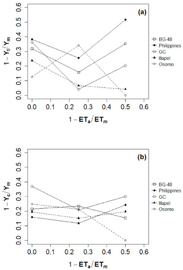 Total water productivity (WPT) measured at IR3 ranged from 18.9 kg m−3 for ‘Philippines’ to 39.3 kg m−3 for ‘Osorno’ (Figure 1a), and a significant increase in the values of marketable water productivity (WPM) was achieved with the irrigation level of 50% (IR3 = 30.4 ± 8.6) (Figure 1b), which was double that of the irrigation level of 100% (IR1 = 14.0 ± 2.1) (Supplementary Table S2). The yield response factor () was calculated for each rootstock based on total yield (Figure 2a) and marketable yield (Figure 2b). The values indicate the level of tolerance of a crop to water deficit, where the greater values represent the lower tolerance. In our results, the value was higher in ‘GC’ (1.17) compared to ‘Osorno’ (0.61). This result reveals a greater tolerance of ‘Osorno’ accession to water shortage.