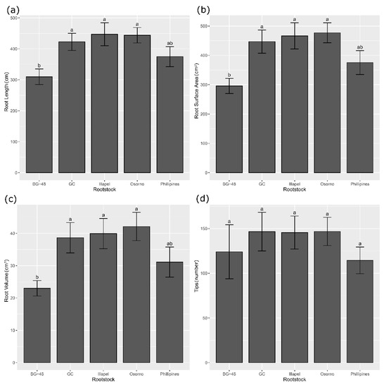 Root system architecture traits of L. siceraria rootstocks grafted onto watermelon cv. Santa Amelia F1 and grown under field conditions. (a) Root length, (b) surface area, (c) root volume, and (d) number of tips. Different letters indicate significant differences according to Fisher’s LSD test (p ≤ 0.01) with Bonferroni correction.