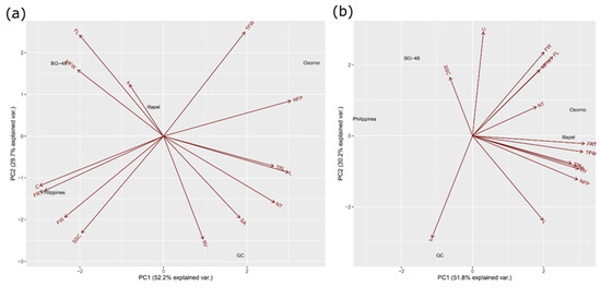 Under the IR1 condition, the two first principal components (PCs) explained 88% of the cumulative variance observed, with 50% at the first and 33% at the second axes (Figure 5a). The parameters that contributed to positive loading to the first principal component (PC1) were TFW, NFP, L, TRL, NT, SA, and RV; while for the second component (PC2), the parameters were MFW, FL, h, TFW, and NFP. In contrast, the parameters °h, C, FL, FW, MFW, FRT, and SSC contributed to negative loading to the PC1, while C, L, FRT, FW, SSC, RV, SA, NT, and TRL contributed with negative loading to the PC2.