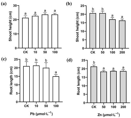 Shoot height (a,b) and root length (c,d) of M. cordata grown hydroponically under control (CK) and varied concentrations of Pb and Zn for seven days. Values are means ± SE (n = 3) with three separate replicates. Means denoted by different letters refer to the significant differences (p < 0.05, Duncan’s test).