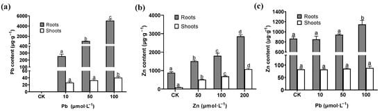 Pb (a) and Zn (b,c) content in shoots and roots of M. cordata grown hydroponically under control (CK) and varied concentrations of Pb and Zn for seven days. Values are means ± SE (n = 3) with three separate replicates. Means denoted by different letters refer to the significant differences (p < 0.05, Duncan’s test).