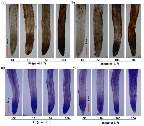 3,3′-diaminobenzidine (DAB) staining in situ is based on the rapid reaction of H2O2 with DAB to form brownish-red spots. The amount of H2O2 in roots can be detected by observing the location of the colored spots. As shown in Figure 3a,b, the production of H2O2 in the root tips of M. cordata gradually increased with the increase of the Pb or Zn concentration, and a small amount of damage was observed on the root tips under the 200 μmol·L−1 Zn treatment. Nitroblue tetrazolium chloride (NBT) staining in situ relies on the reaction of O2− with NBT to produce a blue product. Likewise, the amount of O2− production in roots can be detected by observing the location of the blue spots. As shown in Figure 3c,d, blue-black precipitates appeared in the root tips of the control and treatment groups with different degrees of coloration. The O2− production was not significantly increased in the root tips of the Pb treatment; however, the blue-black spots in the root tips were significantly increased under the 100 and 200 μmol·L−1 Zn treatments. Meanwhile, excess Zn, especially 100 μmol·L−1 Zn, evidently promoted root hair development. Furthermore, the H2O2 content and O2−-producing rate of the roots were basically consistent with the histochemical staining of the root tips of M. cordata (Figure 4).