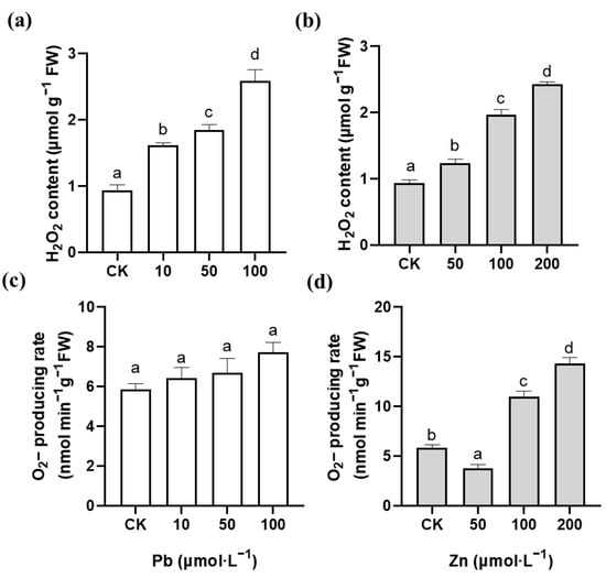 The determination of H2O2 content (a,b) and O2−-producing rate (c,d) in roots of M. cordata grown hydroponically under control (CK) and varied concentrations of Pb and Zn for seven days. Values are means ± SE (n = 3) with three separate replicates. Means denoted by different letters refer to the significant differences (p < 0.05, Duncan’s test).