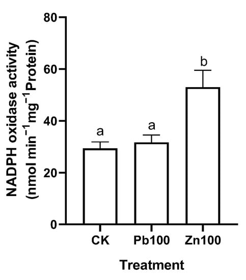 Pb is one of the most toxic environmental pollutants for plants, and Zn is an essential micronutrient associated with proteins and enzymes; however, excess Zn, like Pb, can interfere with numerous biochemical and physiological processes, including metal uptake and transport in plants [4]. The toxicities of Pb and excess Zn are mediated by the formation of reactive oxygen species (ROS), such as superoxide anions (O2−) and hydrogen peroxide (H2O2). ROS are toxic and can oxidize lipids, proteins and nucleic acids, thus causing lipid peroxidation, membrane damage, and enzyme inactivation [10,11]. Plants have antioxidant defense mechanisms that eliminate ROS, especially by enzymatic components such as superoxide dismutase (SOD), ascorbate peroxidase (APX), catalase (CAT), peroxidase (POD) and others. On the other hand, plasma-membrane-bound nicotinamide adenine dinucleotide phosphate (NADPH) oxidase is believed to be responsible for O2− production in plants under heavy metal stress [10,11,12,13].