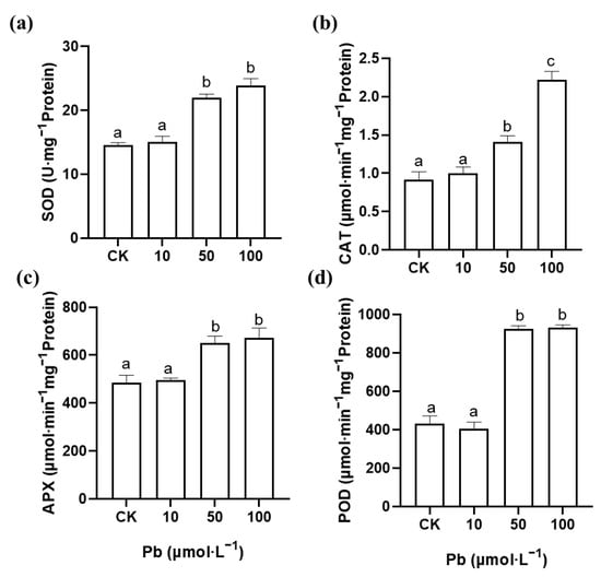 Activity of SOD (a), CAT (b), APX (c) and POD (d) in roots of M. cordata grown hydroponically under control (CK) and varied concentrations of Pb for seven days. Values are means ± SE (n = 3) with three separate replicates. Means denoted by different letters refer to the significant differences (p < 0.05, Duncan’s test).