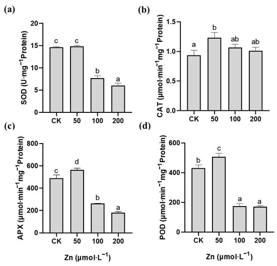 Activity of SOD (a), CAT (b), APX (c) and POD (d) in roots of M. cordata grown hydroponically under control (CK) and varied concentrations of Zn for seven days. Values are means ± SE (n = 3) with three separate replicates. Means denoted by different letters refer to the significant differences (p < 0.05, Duncan’s test).