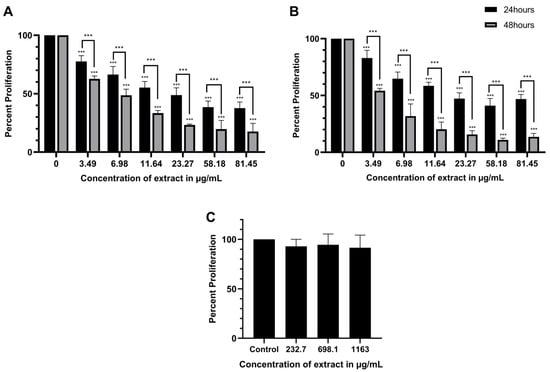 Antiproliferative effect of ScBEE on breast cancer cell lines and normal mesenchymal stem cells. A significant dose- and time-dependent decrease in the proliferation of (A) MDA-MB-231 and (B) MCF-7 cell lines was observed, with no cytotoxic effect on (C) normal mesenchymal stem cells (MSCs) when treated with high doses of ScBEE. Significant differences are reported; *** indicates a p-value of 0.0001 < p < 0.001.