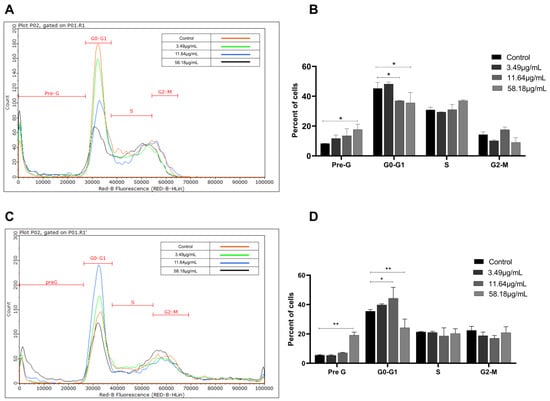 To determine the effect of ScBEE on cell cycle progression, MDA-MB-231 and MCF-7 cells were stained with propidium iodide (PI) followed by flow cytometric analysis after treatment with increasing concentrations of the extract for 24 h. Cells were distributed into four phases (pre-G0, G0-G1, S and G2-M) based on their DNA content. The results showed a significant increase in the percentage of cells present in the pre-G0 phase (DNA < 2 n) from 8.3% to 17.6% and from 5.6% to 19.1% when MDA and MCF cells were treated with the highest concentration of ScBEE (58.18 μg/mL), respectively. Additionally, a decrease in the G0-G1 phase (2 n < DNA < 4 n) from 45.3% in control samples to 35.6% was noticed upon 58.18 μg/mL ScBEE treatment of MDA cells (Figure 2A,B). Similarly, MCF-7 cells showed a significant decrease in the percentage of cells in the G0-G1 phase from 35.5% to 24.2% upon treatment with the highest dose (Figure 2C,D). These results suggest that ScBEE promotes cellular fragmentation of MDA-MB-231 and MCF-7 cells upon treatment with ScBEE for 24 h.