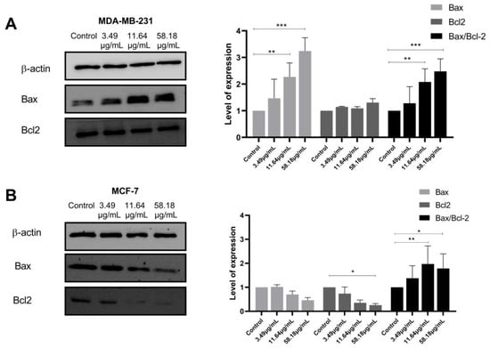 ScBEE activates the mitochondrial apoptotic pathway. Western blot analysis shows the upregulation of the Bax–Bcl2 ratio upon treatment of (A) MDA-MB-231 and (B) MCF-7 cells with increasing concentrations of the extract. Significant differences are reported; * indicates a p-value of 0.01 < p < 0.05, ** indicates a p-value of 0.001 < p < 0.01 and *** indicates a p-value of 0.0001 < p < 0.001. The full-length blots of all trials are reported as Supplementary Figures S3–S6.
