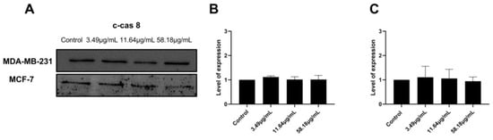 To investigate the proteins involved in the apoptotic signaling pathway triggered by ScBEE in MDA-MB-231 and MCF-7 cell lines, Western blot analysis was carried out. The expression of the mitochondrial-membrane-regulating proteins, Bax and Bcl2, was quantified, revealing a significant increase in the Bax/Bcl2 ratio in both cell lines when the cells were treated with increasing concentrations of the extract for 24 h (Figure 4A,B). Furthermore, the expression of the initiator caspase was measured in MDA-MB-231 and MCF-7 cells. No significant effect was exerted on the expression of cleaved caspase 8 in both breast cancer cell lines (Figure 5). These results suggest the activation of the intrinsic mitochondrial pathway in both cell lines, MDA-MB-231 and MCF-7 cells, in response to the ScBEE.