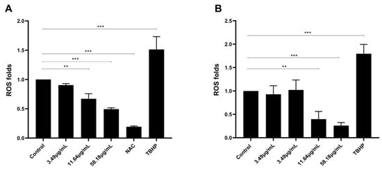 Antioxidant properties of ScBEE in breast cancer cell lines. Measurement of reactive oxygen species production in (A) MDA-MB-231 and (B) MCF-7 cells showed a significant decrease, resulting in increased concentrations of ScBEE. TBHP and NAC were used as positive and negative controls, respectively. Significant differences are reported; ** indicates a p-value of 0.001 < p < 0.01 and *** indicates a p-value of 0.0001< p < 0.001.