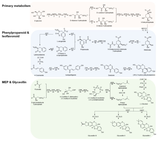 Glyceollin biosynthesis involves around 43 metabolic steps starting from glucose (Figure 1). In primary metabolism, D-glucose is transformed into D-erythrose 4-phosphate through the pentose phosphate pathway, followed by enzymatic condensation with pyruvate, oxidative cyclization, and dehydration to generate shikimate [38,39,40]. Shikimate is initially converted into L-phenylalanine, followed by reductive deamination and hydroxylation to generate 4-coumarate throughout the phenylpropanoid pathway [41,42]. In the isoflavonoid pathway, isoliquiritigenin is generated by condensation of 4-coumarate with CoA and 3-molonyl-CoA and transformed into daidzein. Daidzein is reduced and hydroxylated to produce (3R)-2′-hydroxydihydrodaidzein, the precursor of glycinol [33,43,44]. Finally, glyceollins I, II, and III are produced through the condensation of (-)-glycinol and prenyl diphosphate. The addition of prenyl diphosphate in the position 4 of (-)-glycinol is needed to produce glyceollin I, while the addition in position 2 for glyceollins II and III [45,46,47].