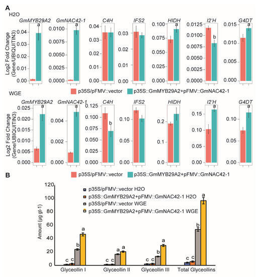 Since GmMYB29A2 and GmNAC42-1 failed to activate glyceollin biosynthesis when each gene was overexpressed individually in the absence of an elicitor [2,33], we tested whether co-overexpressing both transcription factors together could activate glyceollin biosynthesis. GmMYB29A2 and GmNAC42-1 were cloned upstream of the p35S and pFMV viral promoters of the pGEMINI vector [48] and were co-overexpressed 26.6- and 45-fold, respectively, in mock-treated roots (Figure 2A). The co-overexpression resulted in a modest (1.2-fold) upregulation of HIDH and G4DT by qRT-PCR, whereas C4H, IFS2, and I2′H expressions were not upregulated. Glyceollin metabolite amounts also remained unchanged (Figure 2B). In contrast, co-overexpressing GmMYB29A2 and GmNAC42-1 3.5- and five-fold in WGE-treated roots upregulated I2′H and G4DT 1.2- to 1.6-fold, respectively, and resulted in a 1.8-fold increase in the amounts of glyceollin metabolites (Figure 2A,B).