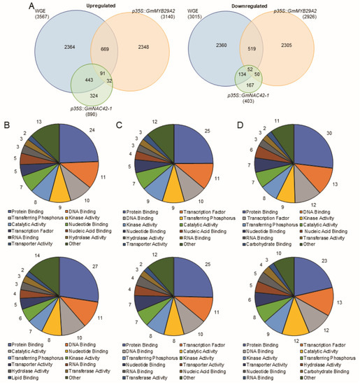 A comparison of differentially regulated genes among P. sojae wall glucan elicitor (WGE)-treated W82 hairy roots and mock-treated hairy roots overexpressing the transcription factors GmMYB29A2 and GmNAC42-1. (A) Venn diagrams of up and downregulated genes. (B) Percentage of ontologies of genes upregulated (top) and downregulated (bottom) by WGE. (C) Percentage of ontologies of genes upregulated (top) and downregulated (bottom) by p35S::GmMYB29A2. (D) Percentage of ontologies of genes upregulated (top) and downregulated (bottom) by p35S::GmNAC42-1. Ontology analysis was conducted using the (https://soybase.org/, accessed on 20 December 2022) Gene model Data Mining and Analysis tool.
