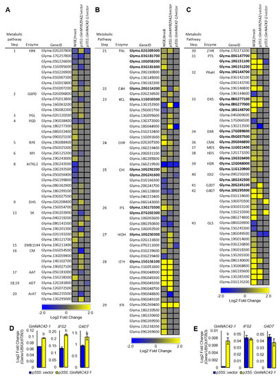 For analysis of glyceollin biosynthesis gene expressions, the enzyme and their corresponding Glyma gene accession numbers were obtained from the PlantCyc database of the Plant Metabolic Network (PMN), except glyceollin synthase (GLS). Cytochrome p450 monooxygenases [67] that were upregulated by WGE treatment were considered candidates of GLS. Any glyceollin biosynthesis gene that were significantly up or downregulated (adjusted p < 0.05) in any RNA-seq comparison (p35S::GmMYB29A2/vector, p35S::GmNAC42-1/vector, or WGE/mock), were compared by heat maps.