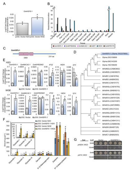 The qRT-PCR confirmed that GmHSF6-1 was upregulated by WGE treatment (Figure 5A). The G. max RNA-seq Atlas (https://soybase.org/, accessed on 20 December 2022) demonstrated that the expression of GmHSF6-1 did not follow developmentally regulated patterns of HIDH or the isoflavonoid regulator GmMYB176 and was more similar to G4DT and the glyceollin regulators GmMYB29A2, GmNAC42-1 (Figure 5B). The predicted peptide sequence of GmHSF6-1 consisted of 231 amino acids and a three-component HSF DNA binding domain (DBD) (Figure 5C). Phylogenetic analysis demonstrated that GmHSF6-1 and four other soybean proteins clustered as a subgroup with the Arabidopsis proteins AtHSFB2a and AtHSFB2b (Figure 5D). The peptide had 55% and 49% similarity to the Arabidopsis proteins HSFA2a (AT5G62020) and HSFA2b (AT4G11660), respectively, which notably have roles in regulating biotic and environmental stress responses [53,54].