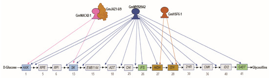 A schematic diagram of WGE-regulated glyceollin biosynthesis genes that are, and are not, upregulated by the transcription factors GmMYB29A2, GmNAC42-1, and GmHSF6-1 when each is overexpressed in the absence of an elicitor treatment. Solid and dotted black arrows indicate single and multiple enzyme-coding genes, respectively. Blue and pink arrows indicate genes that are upregulated by GmMYB29A2 and GmNAC42-1 via RNA-seq. Red arrows indicate genes that were upregulated by GmHSF6-1 by qRT-PCR. Genes that have been characterized to directly interact with GmMYB29A2, GmNAC42-1, and GmHSF6-1 are shown as blue, purple, and orange boxes, respectively. Note, only those genes have been assessed for protein DNA interactions. Gray boxes represent WGE-regulated genes that were not upregulated by overexpressing GmMYB29A2, GmNAC42-1, or GmHSF6-1. The interaction of GmJAZ1-6/-9 inhibits GmNAC42-1′s interaction with gene targets.