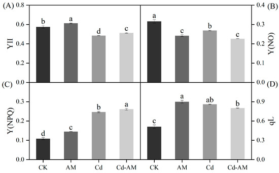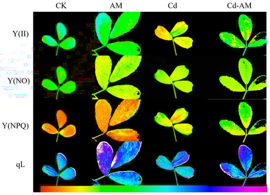 Figure 1 and Figure 2 show the chlorophyll fluorescence parameters and images of leaves under CK, AM, Cd, and Cd-AM treatments. Under normal physiological conditions, inoculation with AMF significantly increased Y(II), Y(NPQ), and qL 1.06-fold,1.34-fold, and 1.76-fold, respectively. However, it significantly reduced Y(NO) by 22.8% (p < 0.05). Under cadmium stress, Y (II) decreased significantly. However, inoculation with AMF under Cd2+ stress significantly increased Y(II) and Y(NPQ) but significantly reduced Y(NO) (p < 0.05). This indicates that inoculation with AMF positively regulated photosynthesis in M. truncatula and alleviated photosynthetic organ damage under Cd2+ stress.