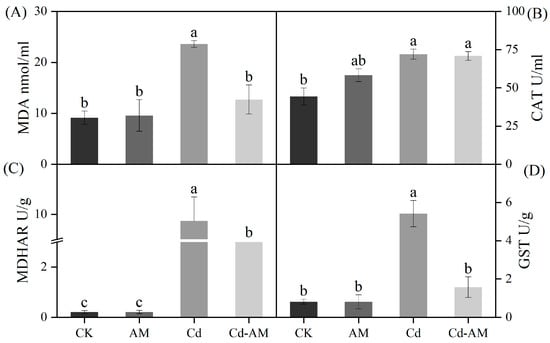 Under normal physiological conditions, inoculation with AMF did not affect plants’ MDA and antioxidant activity, but inoculation with AMF under Cd2+ stress did affect plants. Compared with CK, the MDA content of M. truncatula was significantly increased, 2.5-fold under Cd2+ stress. Compared with the Cd group, the MDA content was significantly decreased by 53% after AMF inoculation, indicating that AMF inoculation could significantly alleviate the oxidative damage of cell membrane caused by Cd2+ stress (Figure 3A). Inoculation with AMF under normal physiological conditions had no significant effect on the antioxidant enzyme system of the plants. Compared with CK, catalase (CAT), monodehydroascorbate reductase (MDHAR), and glutathione sulfhydryltransferase (GST) activity increased significantly in the Cd group, indicating that the plant’s defense mechanisms were still functioning under heavy metal stress (Figure 3B–D). However, after inoculation with AMF, both MDHAR and GST activities were significantly decreased, probably because AMF reduced the toxicity of Cd2+ to plants (Figure 3C,D).
