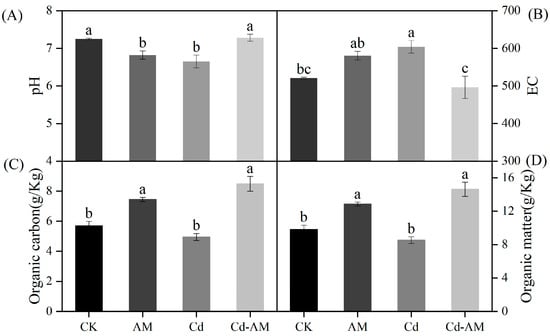 Inoculation of AMF under Cd2+ stress showed no significant difference in soil pH and EC values compared to CK (Figure 4A,B).AMF inoculation under normal physiological conditions and Cd2+ stress significantly increased the soil’s organic carbon and organic matter content (Figure 4C,D). This indicates that the addition of AMF can effectively improve the essential nutrient content of the soil and have a buffering effect on the physicochemical properties of the soil under Cd2+ stress.