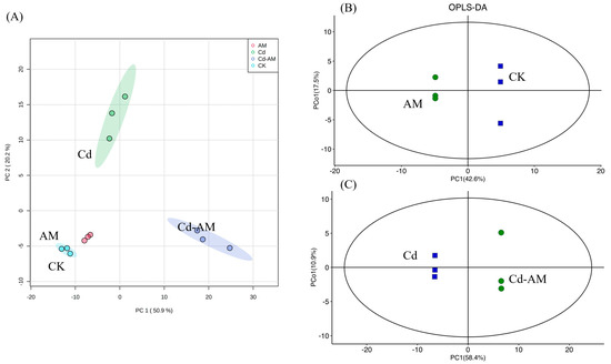 Effect of inoculation with AMF on inter-root metabolites. Principal component analysis (PCA) of the different treatments (A). Orthogonal partial least squares discriminant analysis (OPLS-DA) under different treatments: AM vs. CK (B), Cd-AM vs. Cd (C). The metabolomic dataset was produced through GCMS and then used for the multivariate OPLS-DA modeling (R2X = 0.747 Q2 = 0.996 (B) and R2X = 0.804 Q2 = 0.994 (C)).