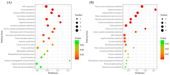 Furthermore, we used the VIP value and P value to screen for differential metabolites. Metabolites that met both VIP value > 1 and p value < 0.05 were considered differential metabolites. The results showed that AM vs. CK screened 80 differential metabolites, of which 61 were upregulated and 19 were downregulated. Cd-AM vs. Cd screened 119 differential metabolites, of which 88 were upregulated and 31 were downregulated. All the differential metabolites in the different comparison groups were matched to the KEGG database to obtain information on the pathways in which the metabolites were involved. The enrichment analysis was performed on the annotated results to obtain the pathways with high enrichment of the differential metabolites. The differential metabolites of AM vs. CK were mainly annotated and enriched in the ABC transporters pathway and the lysine degradation pathway. The differential metabolites of Cd-AM vs. Cd were mainly annotated and enriched in the glycine, serine, and threonine metabolism pathways and the arginine biosynthesis pathway (Figure 6).