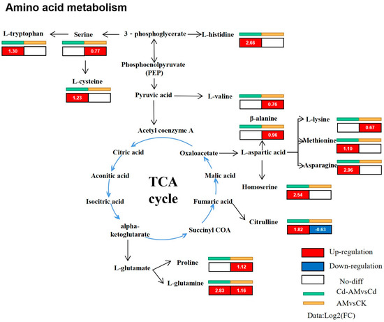The response mechanisms of the plant basal metabolic network induced by the different treatments are shown in Figure 7. Inoculation with AMF had a significant effect on amino acid metabolism. Inoculation with AMF under normal physiological conditions significantly upregulated proline (1.12-fold), L-glutamine (1.16-fold), beta-alanine (0.96-fold), serine (0.77-fold), L-valine (0.76-fold), and L-lysine (0.67-fold). Inoculation of AMF under Cd2+ stress affected the metabolism of various amino acids, significantly upregulating L-asparagine (2.96-fold), L-glutamine (2.83-fold), L-histidine (2.66-fold), homoserine (2.54-fold), citrulline (1.82-fold), L-tryptophan (1.30-fold), L-cysteine (1.23-fold), and methionine (1.10-fold).