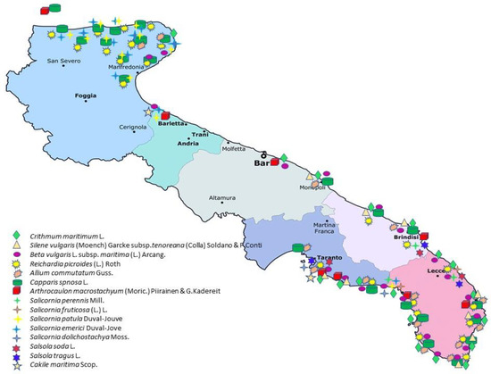 Distribution, across the Apulia region, of the food use of halophytes and halotolerant species treated in this contribution, according to our field observations and literature data.