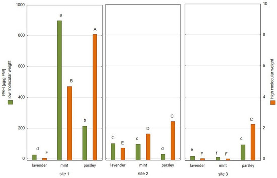 The sums of low molecular weight PAHs (compounds with three or less rings) and high molecular weight PAHs (compounds with four or more rings) determined in the plant material are presented in Figure 1. The highest sum of low molecular weight PAHs (including acenaphthene, fluorene, acenaphthylene, naphthalene, phenanthrene and anthracene) was determined in mint from Site 1 (897.67 µg/g FW), and the lowest was detected in mint collected from Site 3 (9.13 µg/g FW). In turn, parsley from Site 1 was characterized by the highest sum of high molecular weight PAHs (including fluoranthene, pyrene, benzo[a]anthracene, benzo[a]pyrene and benzo[b]fluoranthene), equaled to 8.08 µg/g FW, while mint from Site 3 contained the lowest total sum of high molecular weight PAHs (1.98 ng/g FW). Moreover, parsley samples collected from all three locations were characterized by the highest sum of high molecular weight PAHs compared to other plant samples collected from the same locations (lavender and mint). The low molecular weight PAHs are less lipophilic, more volatile, and more water-soluble than the high molecular weight PAHs. Moreover, high molecular weight PAHs are recognized as human carcinogens [26,27,28].